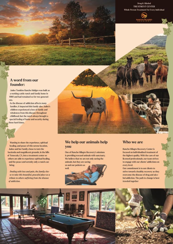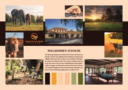 Die warmen, natürlichen Farben der Farm und Reha-Einrichtung stehen für Geborgenheit und der erdfarbene Balken, der das Design durchzieht, gibt Sicherheit
